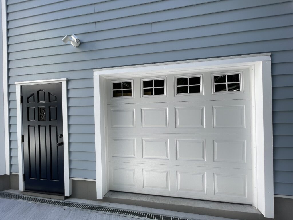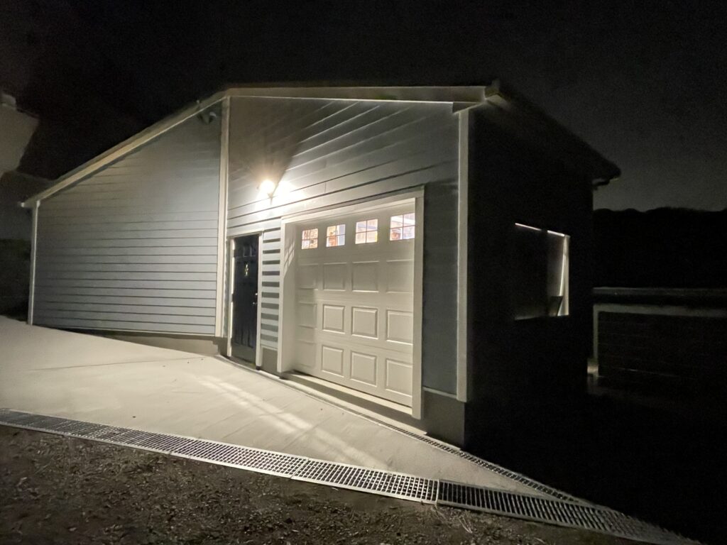 外観は東レラップサイディングを使用。鎧張りによる施工により目地が無くシンプルでありながら可愛らしさと海外にいるかの様な住宅に仕上がっています。リフトマスターのオーバースライダードアは遊び心満載でかっこよく、まさに親父の隠れ家!
